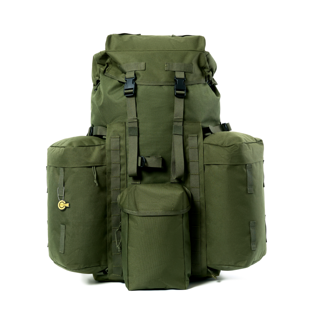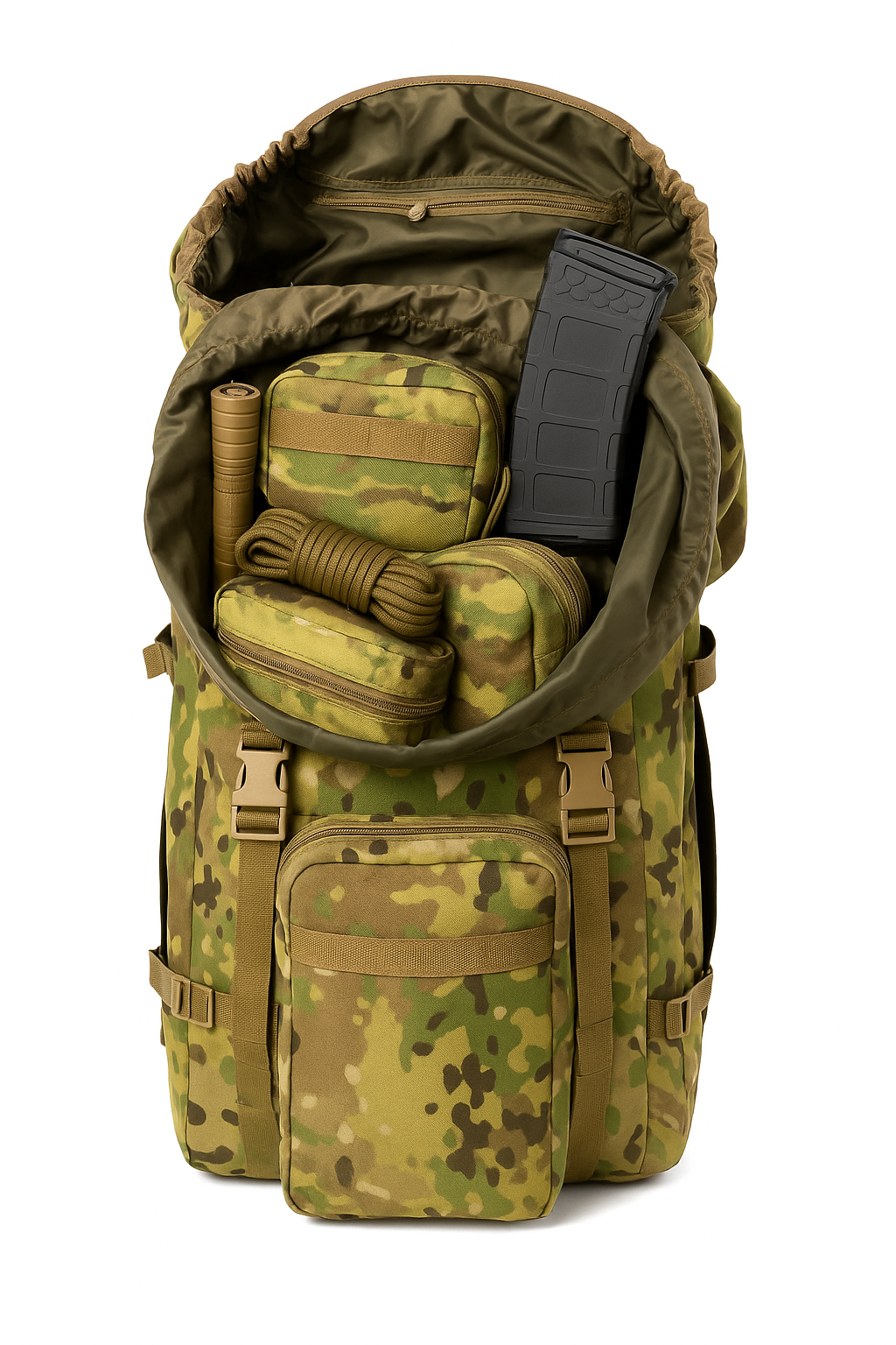 Massive 120L load space with main compartment and detachable side pouches — perfect for long missions or multi-day outdoor travel.